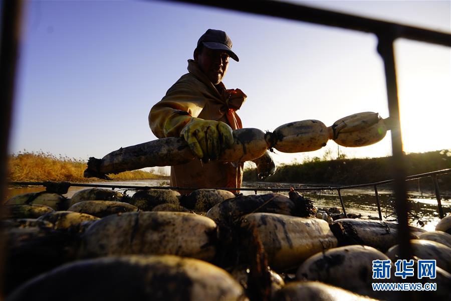 11月18日,工人在采收莲藕。 初冬时节,河北省唐山市曹妃甸莲藕丰收,工人们在结冰之前忙着采收莲藕。 新华社记者 邢广利 摄