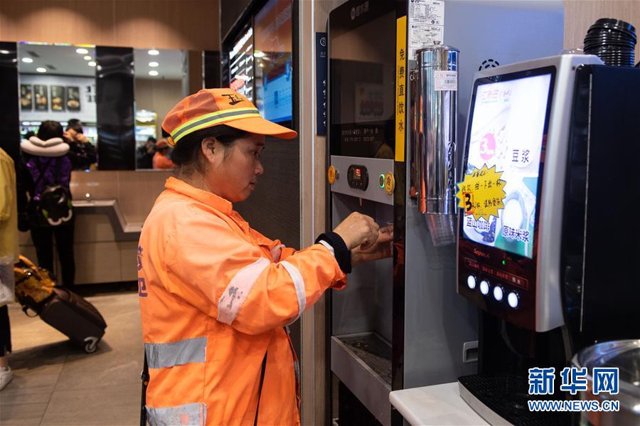 11月17日,环卫工人在株洲市中心广场“建宁驿站”饮用直饮水。新华社发(陈思汗摄)