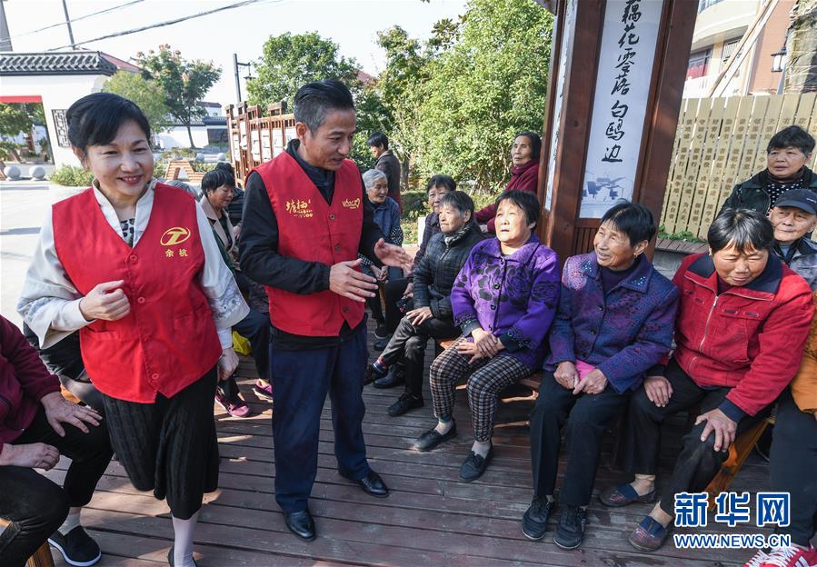 11月20日,志愿者故事员钟红梅(前左一)、徐永革(前左二)在塘栖镇丁河村给村民们用方言讲故事,倡导移风易俗新风尚。 新华社记者 徐昱 摄