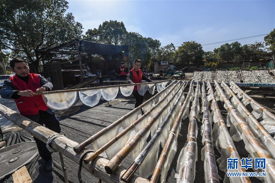 11月20日,“帮帮团”志愿者们在林城镇上狮村的帮扶对象家中帮助晾晒粉皮。新华社记者 徐昱 摄