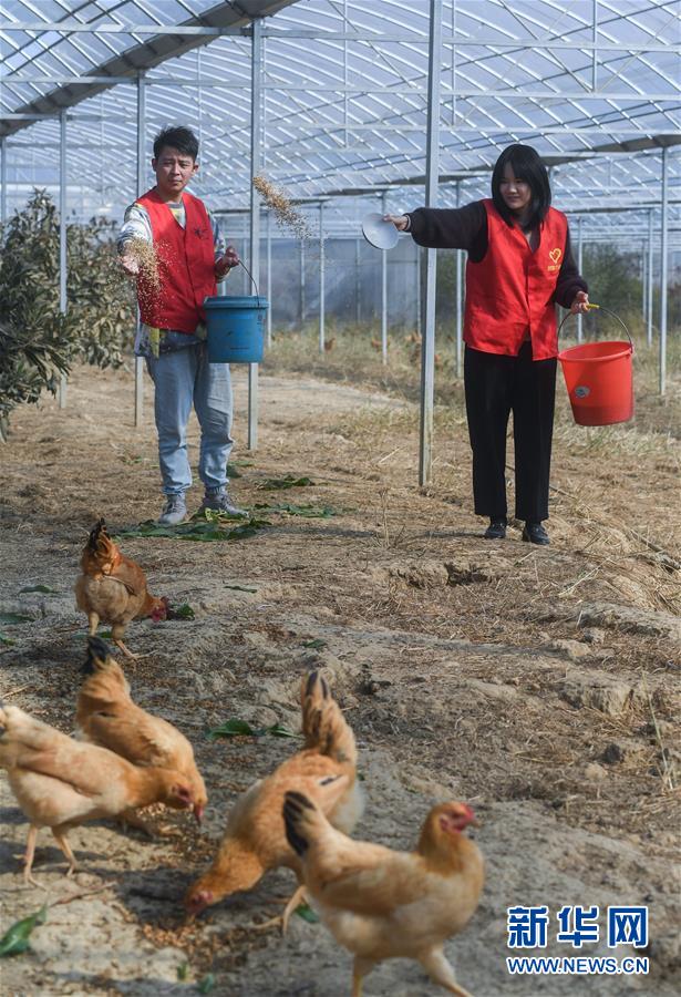 11月20日,“帮帮团”志愿者们在林城镇的帮扶养殖户的大棚中帮助喂鸡。新华社记者 徐昱 摄