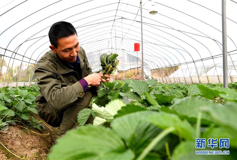 在河南省信阳市新县新集镇,草莓种植户冯磊在草莓采摘园中劳作(11月2日摄)。新华社发(郝源 摄)