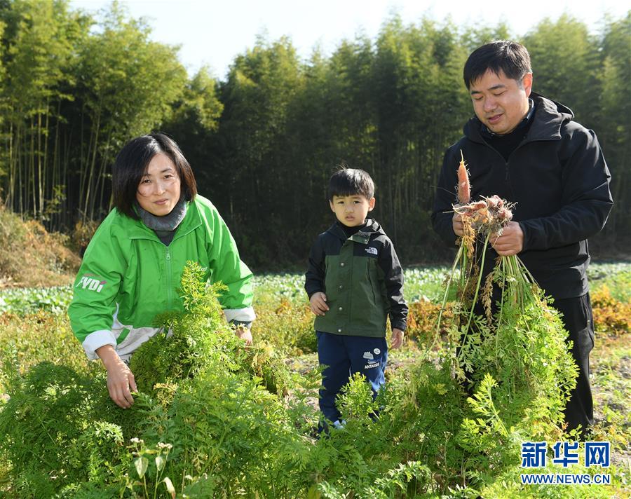 11月20日,王陆良和妻儿在农场收获胡萝卜。 新华社记者 翁忻旸 摄