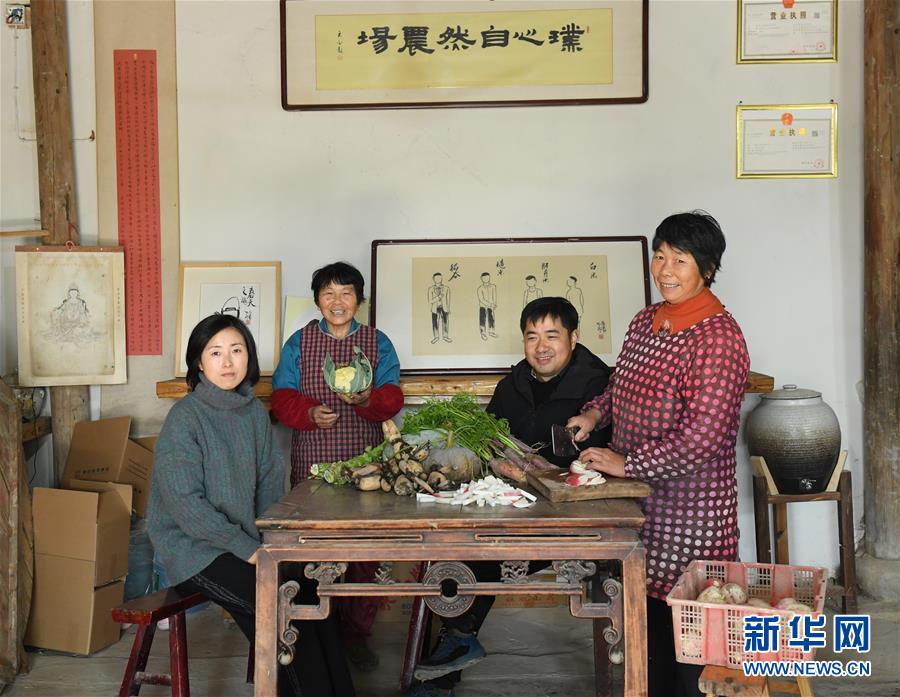 11月20日,王陆良(右二)和妻子蒋淑芳(左一)在“璞心自然农场”跟农场工作人员合影。 新华社记者 翁忻旸 摄