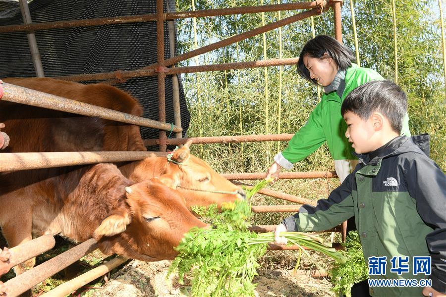 11月20日,王陆良的妻子蒋淑芳和儿子在农场里喂牛。 新华社记者 翁忻旸 摄