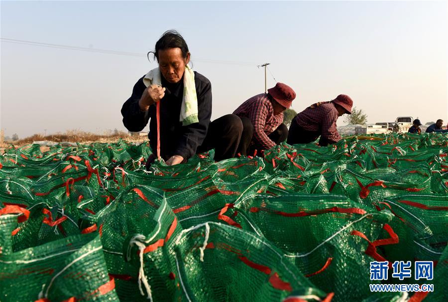 11月20日,河北省南和县三思乡东大村村民将收获的半夏装袋。 近年来,河北省南和县在推进农业供给侧结构性改革中,结合市场需求,立足当地土壤、气候特点,采取“公司+合作社+农户”经营管理模式,依托公司“订单”引导农民发展半夏、白术等中药材种植。目前,南和县中药材种植面积达3万余亩,中药材产业已成为当地农民增收的重要途径。 新华社记者 朱旭东 摄