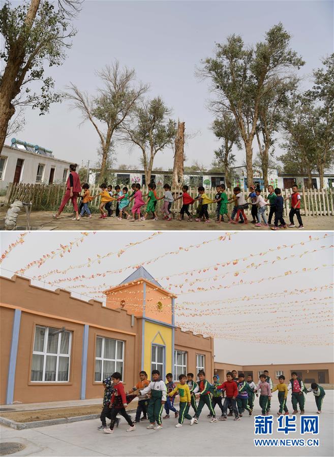 拼版照片:上图为幼儿园学生走在易地扶贫搬迁前的于田县达里雅布依乡学校内(2018年9月5日摄);下图为幼儿园学生走在新校园内(2019年3月20日摄)。