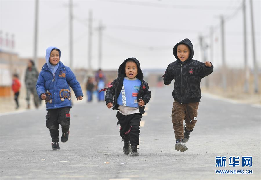 11月18日,幼儿园大班的小朋友放学后走在于田县达里雅布依乡易地扶贫搬迁安置点的硬化道路上。新华社记者 胡虎虎 摄