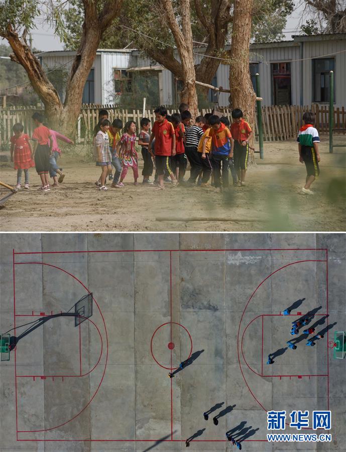 拼版照片:上图为学生利用课间时间在平整易地扶贫搬迁前的校园操场(2018年9月6日摄);下图为学生们在于田县达里雅布依乡易地扶贫搬迁安置点的水泥操场上打篮球(2019年11月19日无人机拍摄)。新华社记者 胡虎虎 摄