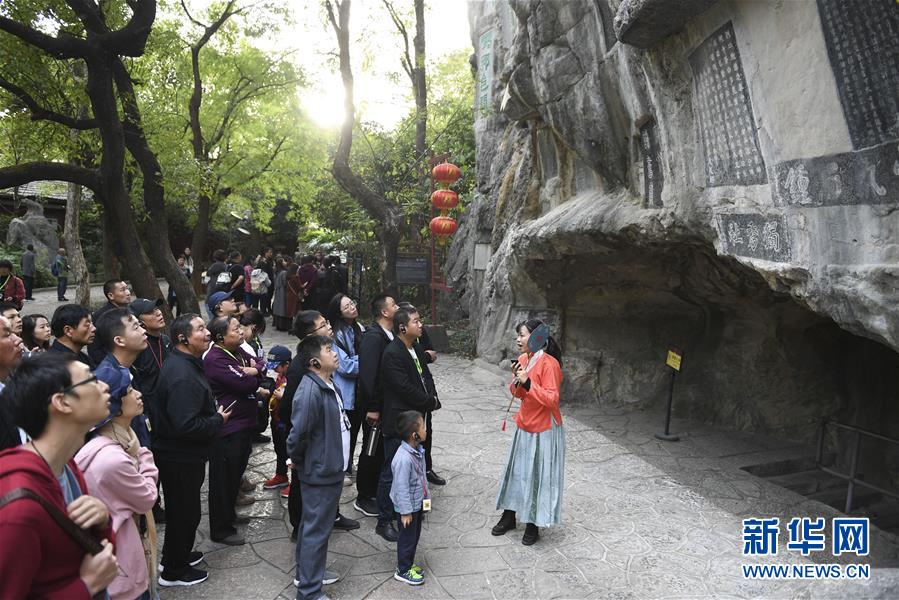11月20日,游客在桂林市独秀峰·王城景区内观看摩崖石刻。 桂林是世界著名的旅游名城,同时也是历史文化名城。在推进国际旅游胜地建设进程中,当地以文促旅、以旅兴文,推动文化旅游生态融合发展,文旅产业提质升级,“一城文化满城绿”的风韵不断彰显,让诗意更浓,远方如家。 新华社记者 曹祎铭 摄