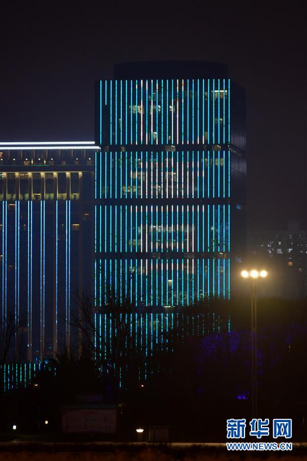 11月20日,太原市长风商务区附近的建筑物点亮儿童日字样灯光。 当日是世界儿童日,多地举办“点亮儿童未来”主题活动,不少标志性建筑点亮蓝色灯光。 新华社记者 曹阳 摄