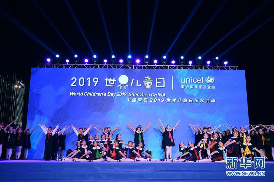 11月20日,小朋友们在深圳市宝安区海滨广场举行的世界儿童日纪念活动上表演。 当日是世界儿童日,多地举办“点亮儿童未来”主题活动,不少标志性建筑点亮蓝色灯光。 新华社记者 毛思倩 摄