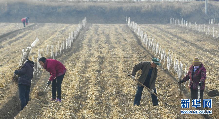 11月20日,河北省武强县北代乡北代村金实家庭农场的工人在种植中华圣桃树。 为推进林业生态建设提档升级、提质增效,河北省武强县因地制宜,抓住当地秋冬季气候偏暖的有利时机,大力推广中华圣桃等树木种植。 新华社记者 李晓果 摄