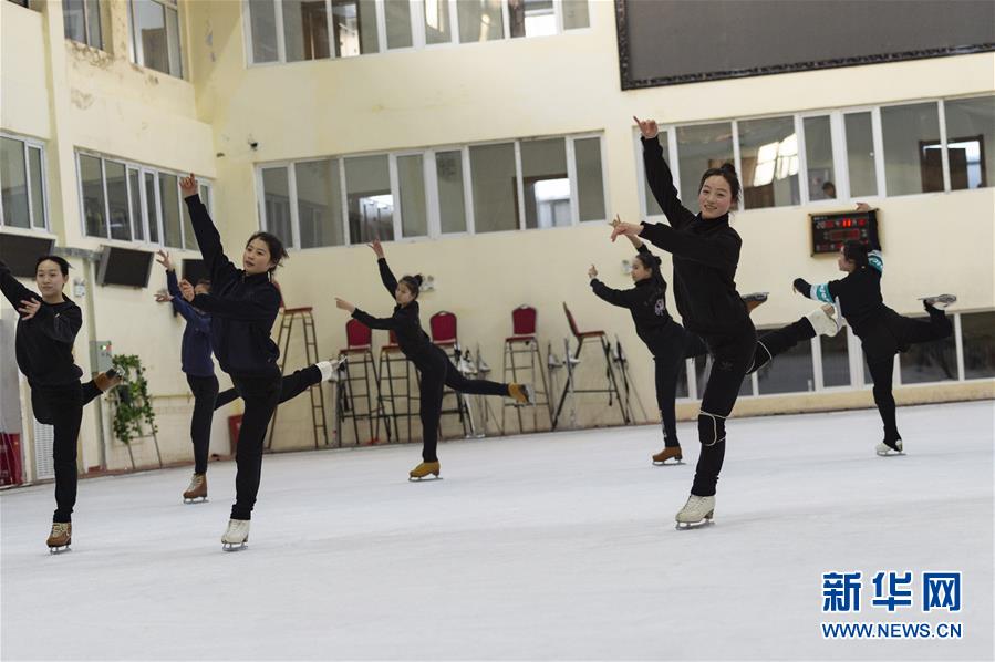 11月14日,在黑龙江省杂技团的冰场内,演员在进行冰上训练。 新华社发(谢剑飞摄)