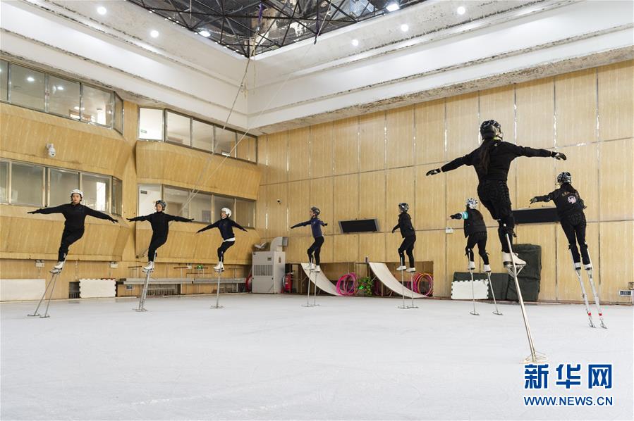 11月15日,在黑龙江省杂技团的冰场内,演员在进行冰上训练。 新华社发(谢剑飞摄)