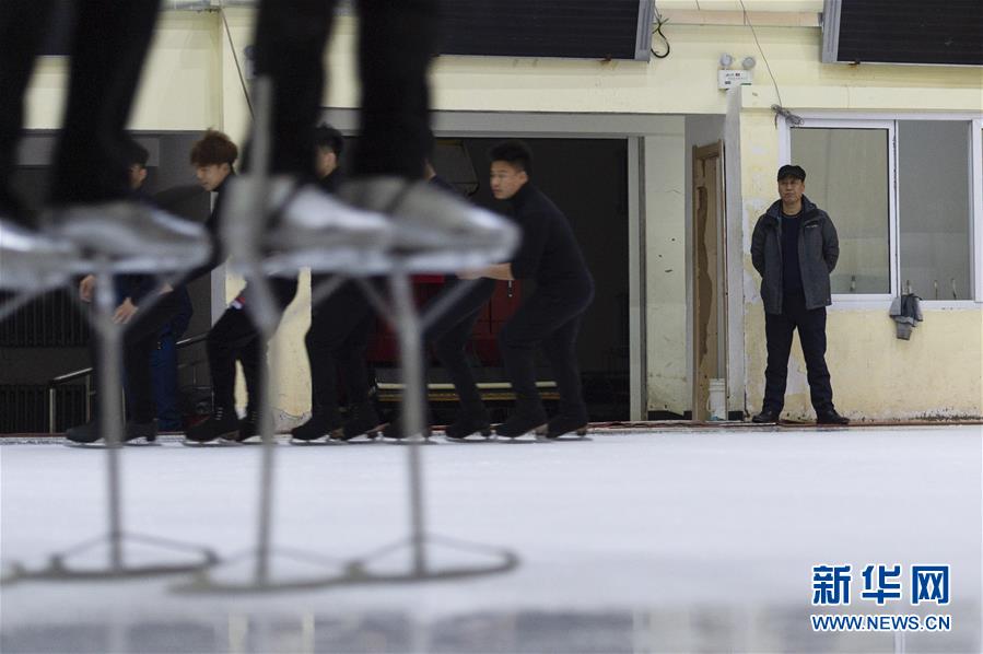11月20日,在黑龙江省杂技团的冰场旁,黑龙江省杂技团团长薛金升在查看演员们的训练情况。 新华社发(谢剑飞摄)