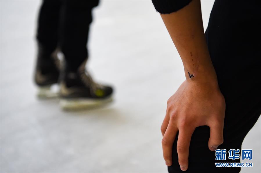 11月20日,在黑龙江省杂技团的冰场内,演员在训练中手上露出被冰刀划伤的伤疤。 新华社发(谢剑飞摄)
