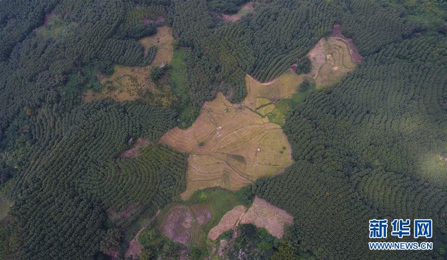 航拍位于白沙黎族自治县青松乡拥处村的山兰稻田(11月16日无人机拍摄)。 新华社记者 罗江 摄