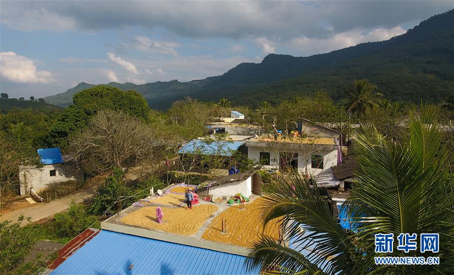 在白沙黎族自治县青松乡青松村,村民在屋顶晾晒山兰稻(11月16日无人机拍摄)。 新华社记者 罗江 摄