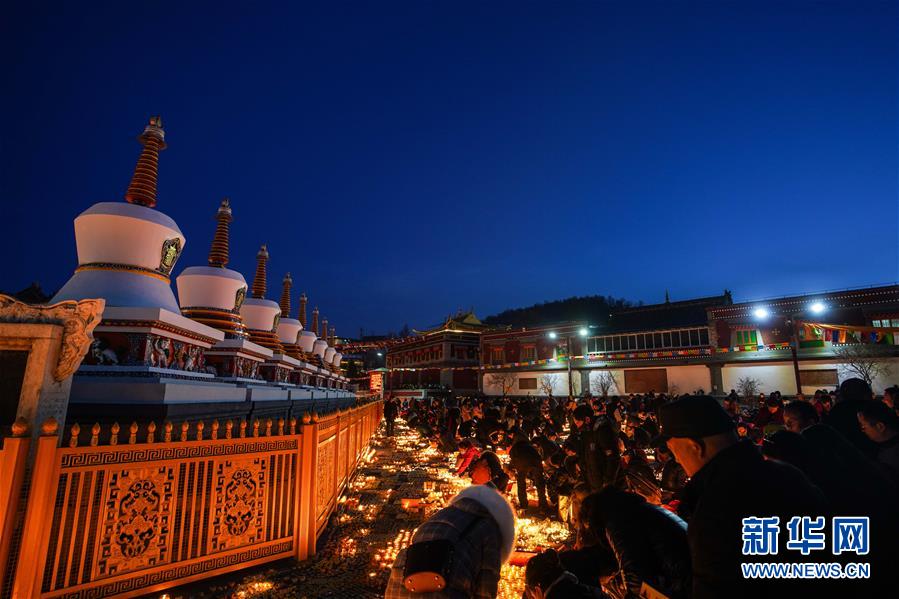 11月21日,信众在塔尔寺的广场上点燃酥油灯。 当日,青海藏族群众迎来一年一度的燃灯节。众多僧众在塔尔寺燃起上千盏酥油灯纪念宗喀巴大师,祈愿家人吉祥安康。 新华社记者 吴刚 摄