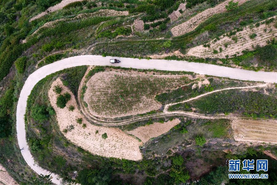 在山西翼城县南岭村,村里的工作人员开着三轮车给缺水的自然村送水(7月3日无人机拍摄)。今年山上的旱情比较严重,自然村里大部分旱井都干涸了,村委会每隔几天就用三轮车送水上山。 新华社记者 詹彦 摄
