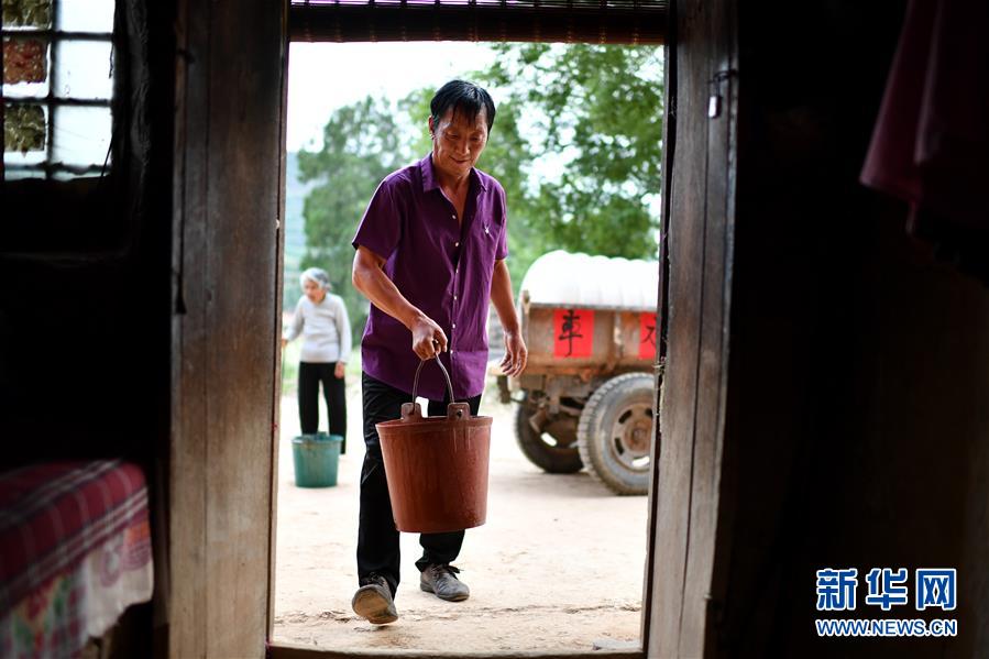 在山西翼城县南岭村石坡自然村,村支书张奎言在给村民张爱芝家送水(7月3日摄)。80岁的张爱芝一个人生活,因为年龄大了挑不动水,日常生活用水全靠村委会工作人员送水和邻居帮忙。 新华社记者 詹彦 摄