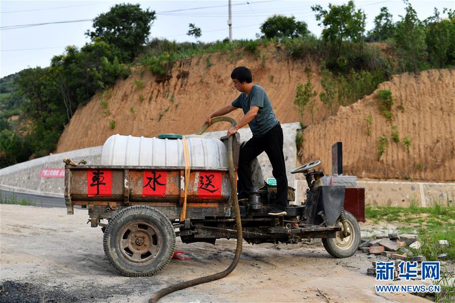 在山西省翼城县南岭村村委会附近,驻村第一书记王晓华从一口旱井里抽水,准备把水送到山上缺水的自然村(7月3日摄)。 新华社记者 詹彦 摄