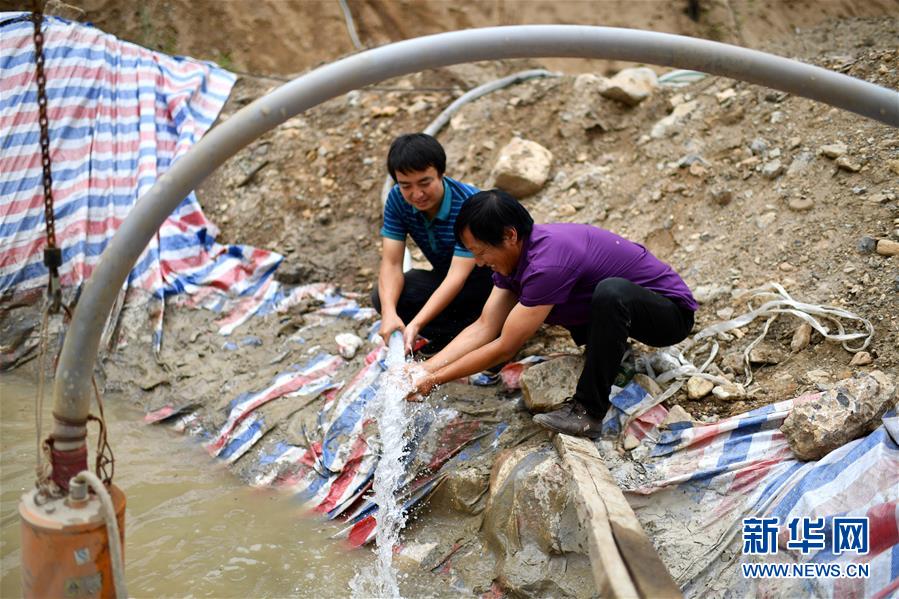 在山西翼城县南岭村打井工地,村支书张奎言(右)和驻村第一书记王晓华在查看抽水情况(7月4日摄)。 新华社记者 詹彦 摄