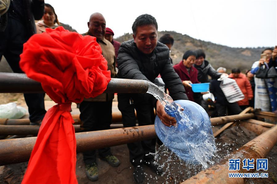 11月20日,在山西翼城县南岭村打井工程竣工仪式现场,村民围在水管边排队接水。 新华社记者 詹彦 摄