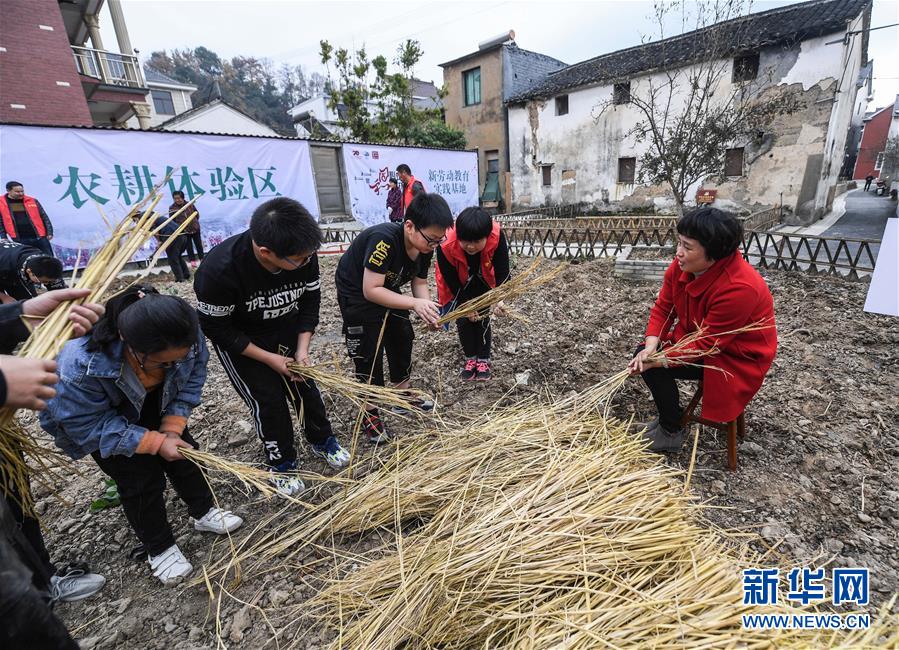 11月22日,小学生在参加环山乡嘉年华的农耕体验编草绳活动,这也是孩子们第二课堂的重要内容之一。新华社记者 徐昱 摄