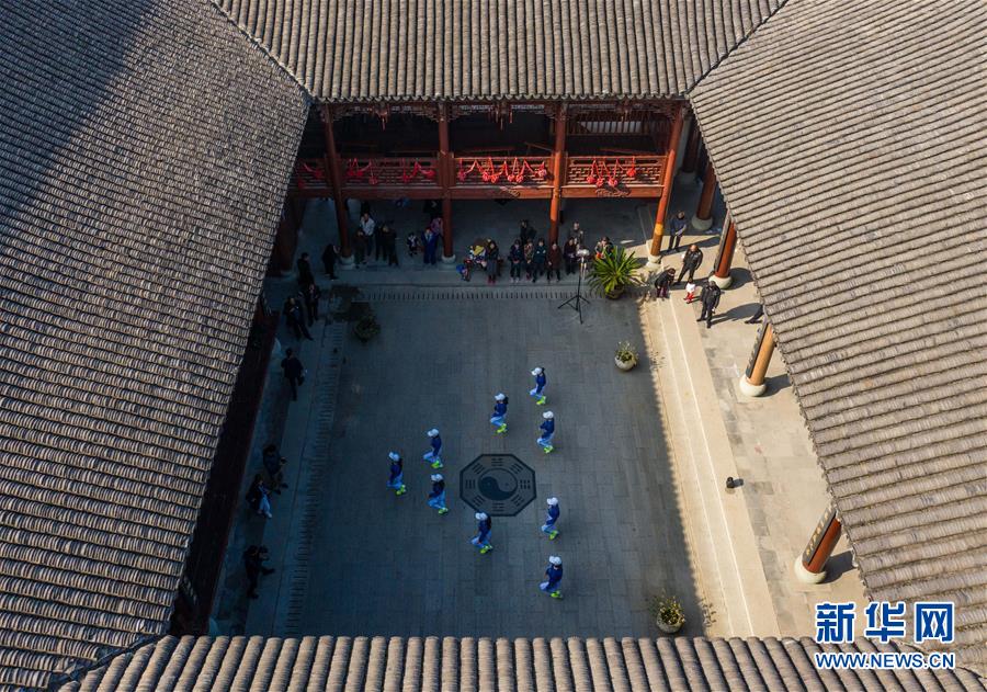 11月22日,乡村舞蹈队在环山乡的文化礼堂内参加乡村舞蹈大赛(无人机拍摄)。新华社记者 徐昱 摄