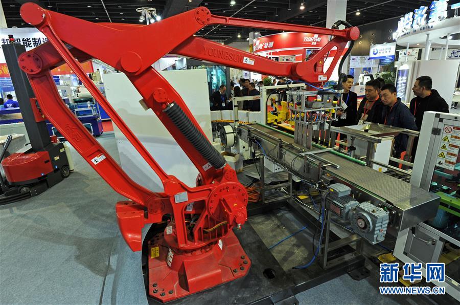 11月21日,采购商在参观杭州市一家智能装备企业推出的自动化包装生产线。 11月21日至23日,以“智能、绿色、创新”为主题的2019中国义乌国际智能装备博览会举行,吸引了美国、德国、日本等国家和地区以及全国各地的约500家企业、3万余名中外采购商参展。 新华社记者 谭进 摄