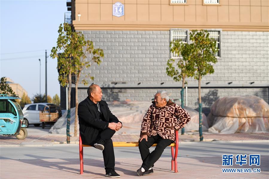 两位老人在河南省封丘县黄河滩区居民迁建项目后辛庄小区聊天(11月19日摄)。新华社记者 陈晔华 摄