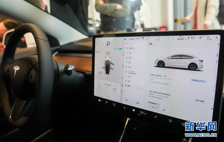 11月22日在上海一家特斯拉体验店拍摄的特斯拉国产Model 3车内前排。特斯拉国产Model 3标准续航升级版续航里程为460公里,起售价为355800元。 新华社记者 丁汀 摄