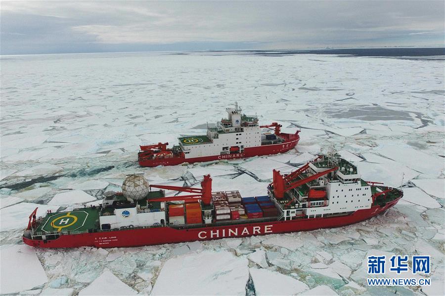 “雪龙2”号(后)和“雪龙”号航行在南极圈内浮冰区(无人机摄于2019年11月20日)。新华社记者 刘诗平 摄