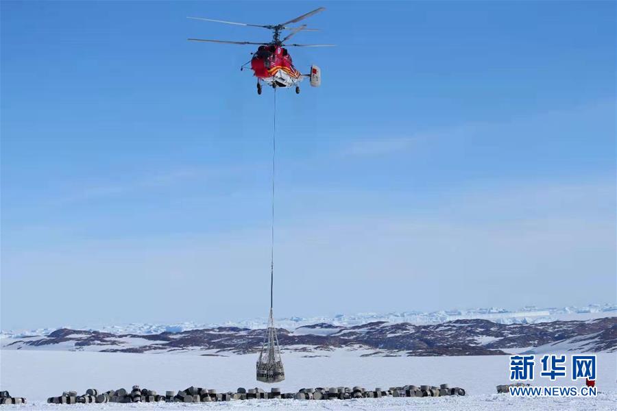 直升机将货物从“雪龙”号上调运至内陆出发基地(11月23日摄)。新华社记者 刘诗平 摄