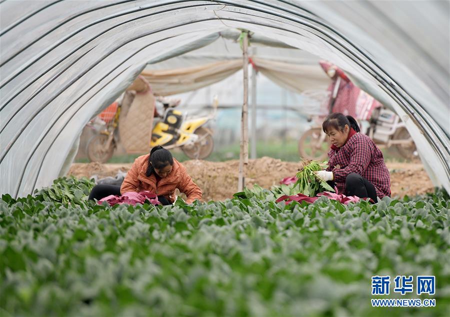 两名农户在河北省魏县德政镇后西营村的农业大棚内收割菠菜(11月24日摄)。 近年来,河北省邯郸市魏县坚持把产业扶贫作为群众脱贫的根本途径和长久之策。2018年,魏县实现脱贫摘帽后,扶贫力度不减,通过扶贫产业园、“扶贫微工厂”、特色产业等形式扩大帮扶路径,使困难群众在家门口实现持续稳定增收,探索出防止返贫的产业之路。 新华社记者李贺摄