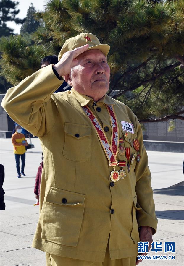 10月17日,张贵斌老人在家属陪同下参观辽沈战役烈士陵园,这是张贵斌老人向辽沈战役牺牲的烈士敬军礼。新华社发