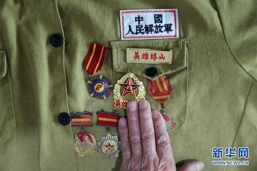 11月7日,张贵斌老人抚摸军功章。新华社记者 杨青摄