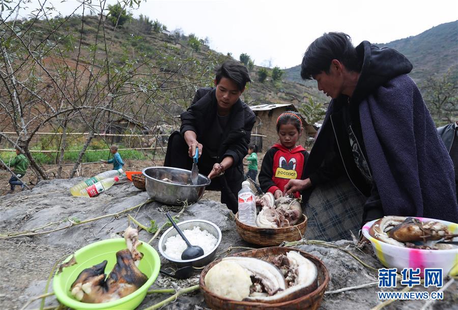 11月24日,在昭觉县支尔莫乡阿土列尔村,俄底曲正(左)和阿牛(右)在准备祭祀用的猪肉和羊肉等食物。 11月20日至26日是四川省凉山彝族自治州大小凉山彝族群众传统节日——彝族年,悬崖上的阿土列尔村的彝族群众杀年猪、祭祀和走亲拜年,庆祝一年一度的彝族年。 阿土列尔村是“悬崖村”,位于四川省凉山彝族自治州昭觉县支尔莫乡,坐落在海拔1400-1600米山坳中,这里居住着60多户彝族群众,村民走出大山,需要攀爬悬崖。近年来,经过政府和社会各界的有力帮扶,“悬崖村”已经“藤梯”换“钢梯”,孩子们上学不再“步步惊心”,村里开通4G网络、设立银行助农服务点,还吸引社会资本打造文旅项目,让不少村民从“放羊娃”变成了山地旅游向导。 新华社记者 江宏景 摄