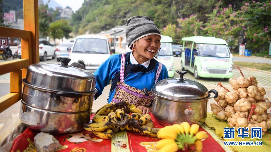 这是广西凌云县浩坤村群众在景区摆放水果等食品接待游客(11月24日摄)。 新华社记者张爱林
