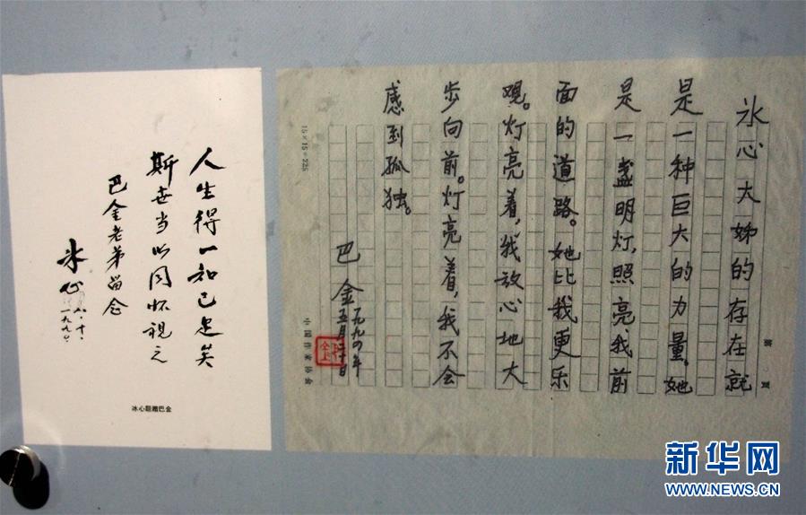 11月25日拍摄的在上海徐汇艺术馆展出的巴金与冰心的手札。 当日,上海举行纪念巴金诞辰115周年活动。巴金故居、中国现代文学馆、上海文学发展基金会在徐汇艺术馆联合主办的“温暖的友情——巴金与友朋往来手札展”开幕,展出巴金与鲁迅、叶圣陶、茅盾、冰心、沈从文、赵树理等老友的往来手札。 新华社记者 任珑 摄