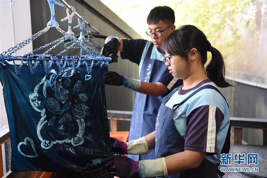 两位学生在郑美淑开办的“卓也小屋”染布工坊内体验蓝染制作过程(11月14日)。 新华社记者 陈斌 摄