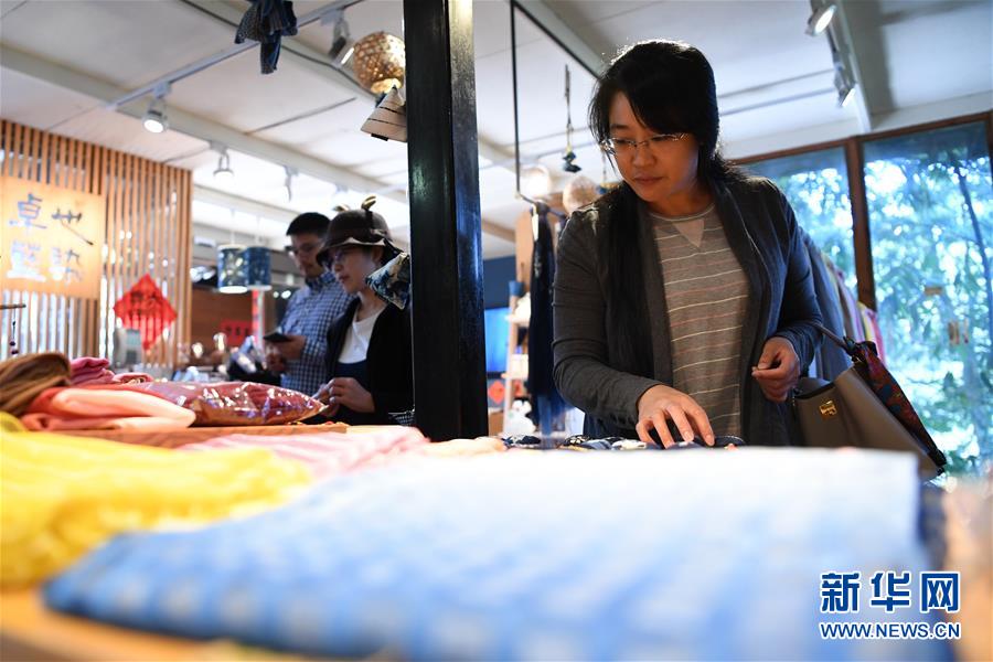 顾客在郑美淑开办的“卓也小屋”染布工坊挑选蓝染商品(11月14日)。 新华社记者 陈斌 摄