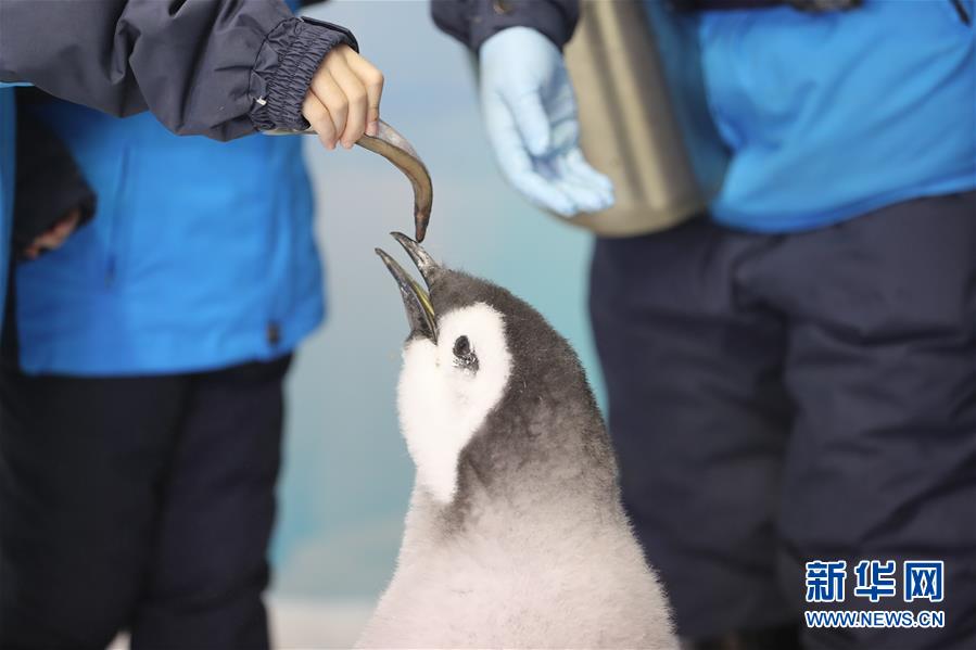 11月25日,小学生给帝企鹅喂食。 当日,来自广州和珠海的小学生代表来到珠海长隆海洋王国,参加企鹅关爱活动,零距离接触今年新生的帝企鹅。本次活动旨在加强极地科普教育,提高小学生保护动物和呵护极地的意识。 新华社记者 卢烨 摄
