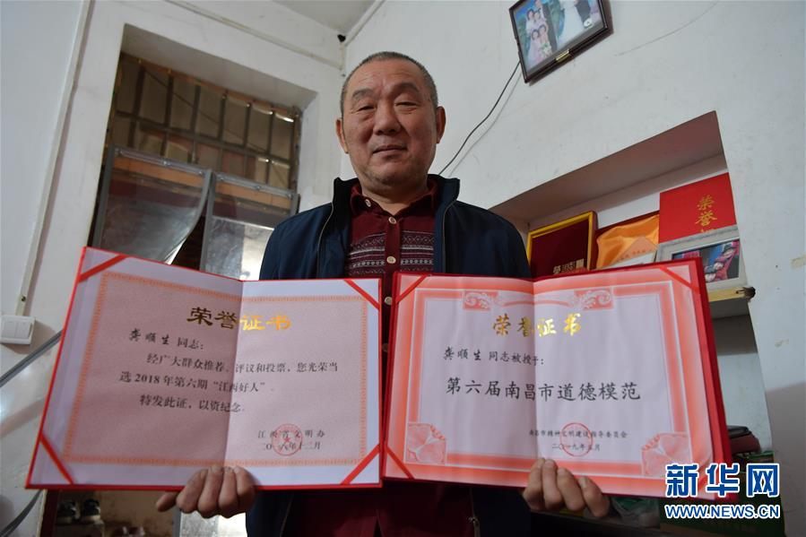 在江西省南昌市青山湖区湖坊镇永人村,龚顺生展示他获得的“江西好人”和“南昌市道德模范”荣誉证书(11月20日摄)。新华社记者 彭昭之 摄