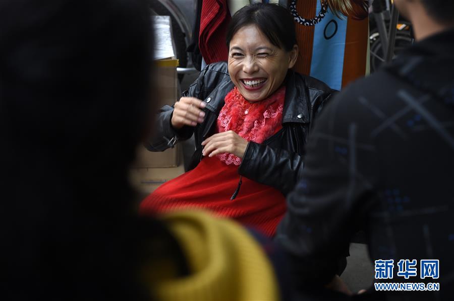 “板凳姑娘”苏晓琳在自己经营的阳光电脑店门面前和街坊邻居聊天(11月22日摄)。新华社记者 韩瑜庆 摄