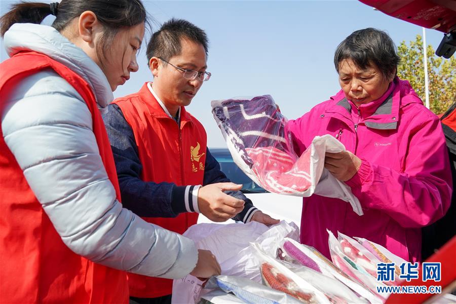 顾金珍(右)和当地志愿者一起整理毛衣,准备寄给西部山区的贫困学子(11月20日摄)。新华社记者 李博 摄