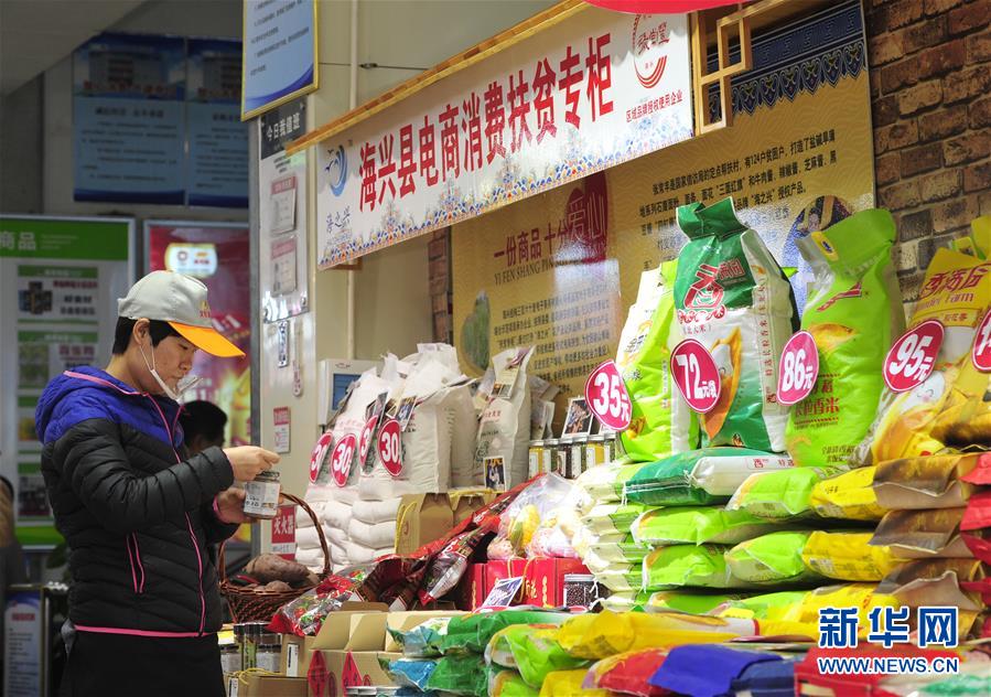 11月25日,海兴县义信商厦工作人员在消费扶贫专柜前为新上架的商品贴上价格标签。 近年来,河北海兴县把消费扶贫作为发挥全社会力量参与扶贫的切入点和突破口,积极探索“电商企业+农业合作社+贫困户+消费扶贫”的模式。目前,海兴县通过设立“电商消费扶贫专柜”,“线上+线下”展示销售农业合作社和贫困户的“订单式”农副产品,带动1600余名建档立卡贫困户和17个贫困村集体实现增收。 新华社记者 牟宇 摄