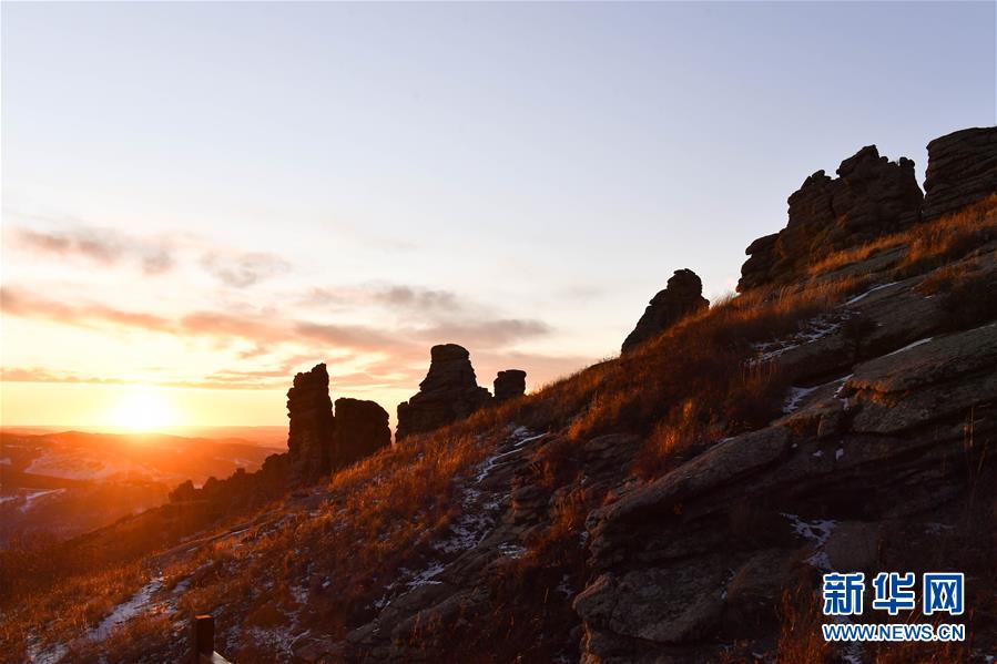 这是11月25日拍摄的克什克腾石阵景区。 克什克腾石阵景区位于内蒙古赤峰市克什克腾旗,是国家5A级景区。冬日黄昏,在落日和晚霞的映衬下,克什克腾石阵景区一派壮美景象。 新华社记者 王雪冰 摄